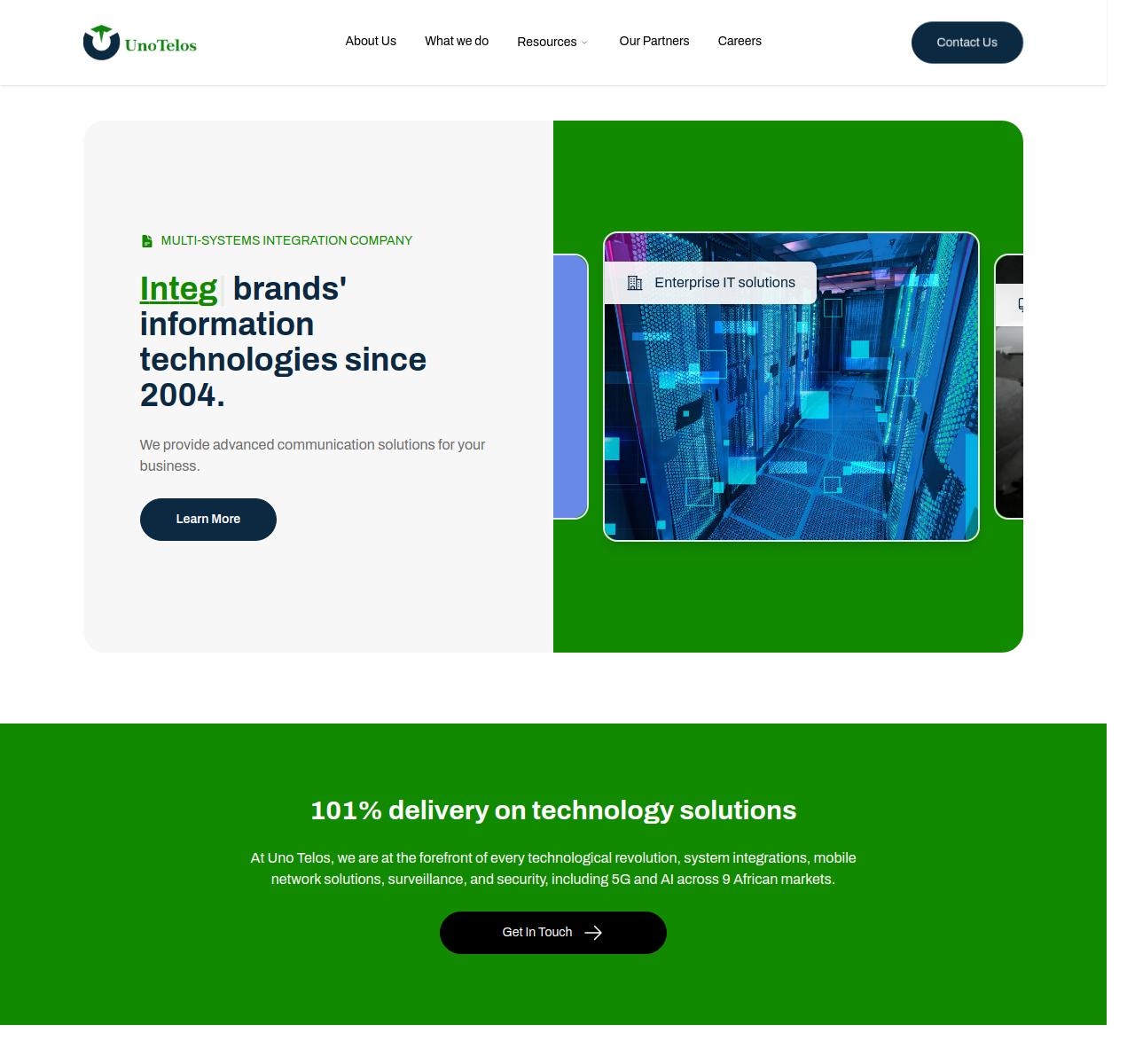 Unotelos is at the forefront of every technological revolution, system integrations, mobile network solutions, surveillance, and security, including 5G and AI across 9 African markets. The website was built with NextJS and Strapi Headless CMS.